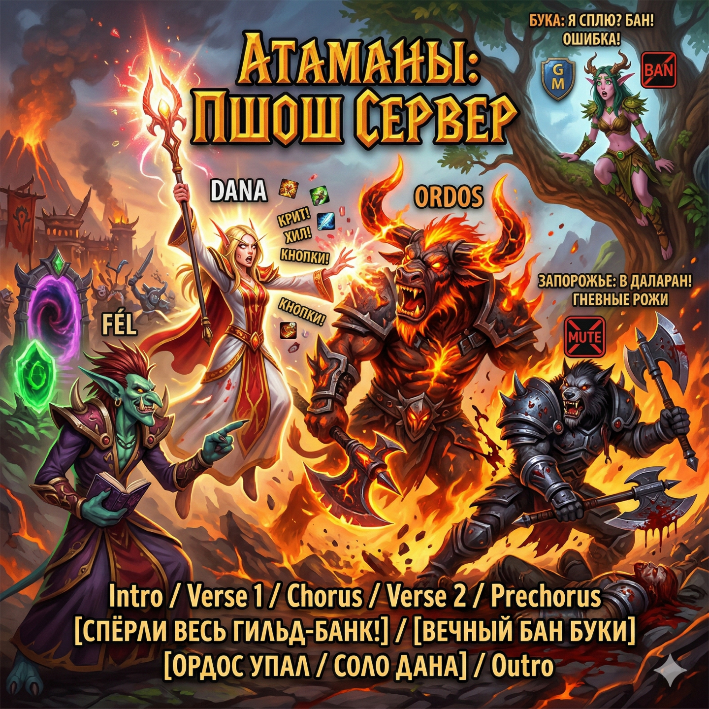 Запорожье, хитрый вар, Применив коварный дар, Пишет в чат админу Буке, Чтоб не умереть со скуки: Свет мой, Бука, подскажи, Логи серва покажи: Кто на пшоше всех милее, Всех дамажней и хитрее? Чей рывок в бою больней? Я ли круче всех парней? Бука, девушка-ГМ, Отвечает без проблем: Ты, конечно, спору нет; Самый подлый на весь свет. Всем ты пакостишь умело, Но скажу тебе я смело: Есть на сервере тут Дана, Без подвоха и обмана! У нее сто персонажей: Эльфов, орков, светлых стражей. Скилл хромает — ну и пусть! Разгоняет Дана грусть. Кнопки путает порой, Но за нубиков — горой! Всем поможет, всё поймет, Хоть и ДПС не тот! С ней играет варлок Фель, С ним не страшна ей метель: Он шкафы ей ставит быстро, Камень душ кидает часто. Если Дана упадет — Фель подняться вмиг дает. Так что, хитрый Запорожье, Не строй гневные ты рожи! Хоть ты в ПвП страшней, Дана на пшоше всех милей! Вар от гнева потемнел, Сделать пакость захотел: Я вам, нубы, покажу! Ваш уютный флекс сложу! В рейд Осада, в жесткий флекс, Собрала тут Дана всех. Завела она друида, Чтобы хилить без обиды. Кнопок много — ну и пусть! ХОТами разгонит грусть! Тут и пуги, и друзья, Вайпаться никак нельзя. Только бафнулись бойцы — Вар летит во все концы! Чардж в Гарроша, прыжок, крик: Ниндзя-пулл в тот самый миг! Босс взревел, топор поднял, Всех по лужам раскидал. Дана в панике молчит, Только мышкою стучит! Но не спит товарищ Фель, Взял Гарроша на прицел. Камень душ на Дану — хлоп! Чтоб не снес начальник лоб. Ставит гейты для братвы, Чтоб бежали от беды. Запорожье в кливе мрёт, Злобно спам он в чатик шлёт. Тут ГМ вступает в бой — Бука пишет: Боже ж мой! Запорожью — мут на час, Чтоб не вайпал больше нас! Отправляйся в Даларан, Успокой свой ураган. Дана ресс всем раздает, Рейд из лужиц восстает. И смущается она: Я тут хилила... как бревна... Снова макрос не нашла, Чуть весь рейд не унесла! Пуги в чате: Ерунда! С Даной весело всегда! Снова пулл, Гаррош упал, Каждый лут свой разобрал. Пусть скилла у Даны нет, Для всего пшоша — она свет! Дни идут, Гаррош забыт, Вновь у Даны грустный вид. У неё есть клан, семья, Где все нубики — друзья. Имя гильдии простой — Атаманы — звук крутой. В банк заходит не спеша, И сжимается душа: Смотрит Дана в инвентарь — Спёрли весь гильдейский ларь! Ни руды, ни зелий нет, Померк вмиг весь белый свет! Дана в чатик слёзы льёт: Крыса в гильдии живёт! Вы не люди, просто мрак! Крысы! Делают же так! В чат рыдает на весь Пшош: Это в спину подлый нож! Я ж вас всех качала, ну! А теперь иду ко дну… Всё, терпенью вышел срок! Всем воришкам дам урок! Кнопку Кик нажав в слезах, Сеет панику и страх. Половину прогнала, Так обида тяжела! Глядь — а хитрый Запорожье В банке строит злые рожи. Это он твинка вкачал, Весь общак в ночи украл! Тут ГМ, девица Бука, Говорит: Какая мука! Посмотрю я в свой журнал, Кто гильд-банк обворовал. Смотрит Бука: Всё понятно! Всё вернётся вмиг обратно. Банк мы Дане возвратим, Вару — бан на год вкатим! Дана слёзы утирает, Снова пугов собирает. Фель смеётся: Ерунда! Справимся со всем всегда! И на Пшоше мир да гладь, Можно заново играть. Дни идут, и вот опять Дана стала рейд сбирать. Остров ждет Вневременной, Там запахло вновь войной. Сам Ордос горит огнём, Рейд стоит перед вождём. Только бафнулись чуток — Запорожье дал Рывок! Агрит босса — и бежать, Чтобы рейд весь обломать. Босс за варом — и назад! Вот эвейд, и вайп, и ад! Раз эвейд, и два эвей