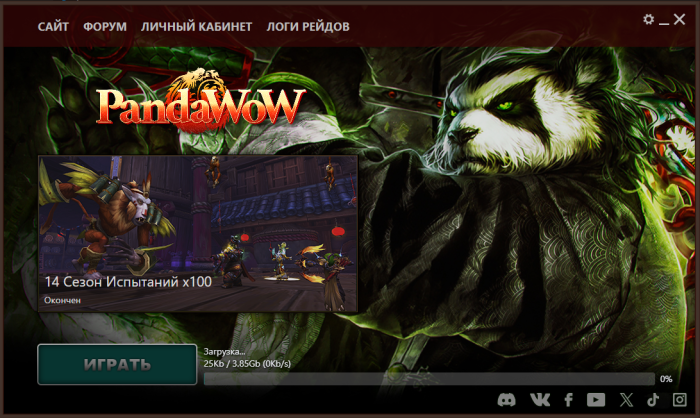 Здравствуйте. На скрине старый лаунчер, который уже давно не поддерживается. Новый - https://pandawow.me/files/launcher/PandaWoWLauncher.exe. Если новый не будет качать клиент - открыть config.json любым текстовым редактором и тут 1 поставить вместо 0. - Yesterday