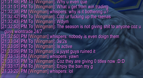 1. https://cp.pandawow.me/en/armory/char-3-7123207 and https://cp.pandawow.me/en/armory/char-3-6715996 2. Xfun 3. Bro is wintrading in 2s on his Paladin he is playing games either vs Grevious people or 1 person only. 4. Proof