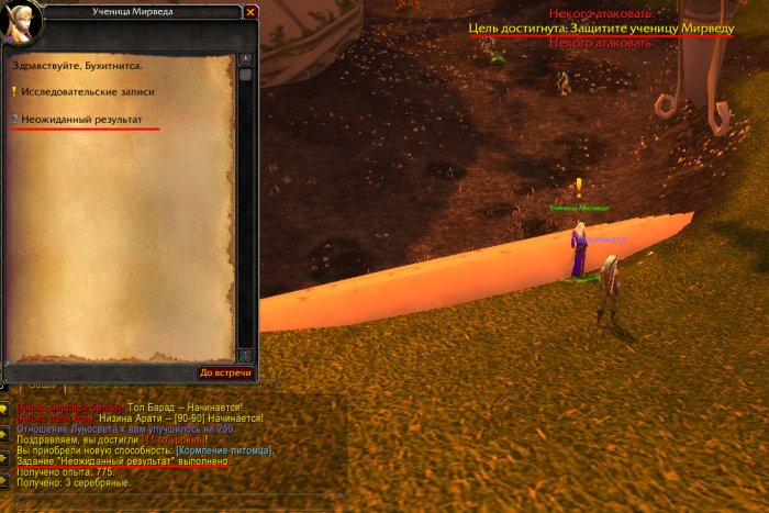 1) Неожиданный результат 2) х100 3) После диалога должно бежать 3 моба, 3 меня их было 2, но допустим. https://db.pandawow.me/?npc=15402 также должна учавствовать в баталии, огненый шар. после выполнения, постоянный спам достигнутой цели. Хотел отменить задание, чтобы перепроверить, отменил, при взятии его заного, сразу и завершилось, взятие пропустилось. При том что у неё что задание взято осталось, хотя в списке заданий его нет, и сообщение о достигнутой цели не пропало. Взял следующее задание, вопросик серый с заданием пропал, спам остался. Релог не помог. Исправление персонажа, вопрос решил.