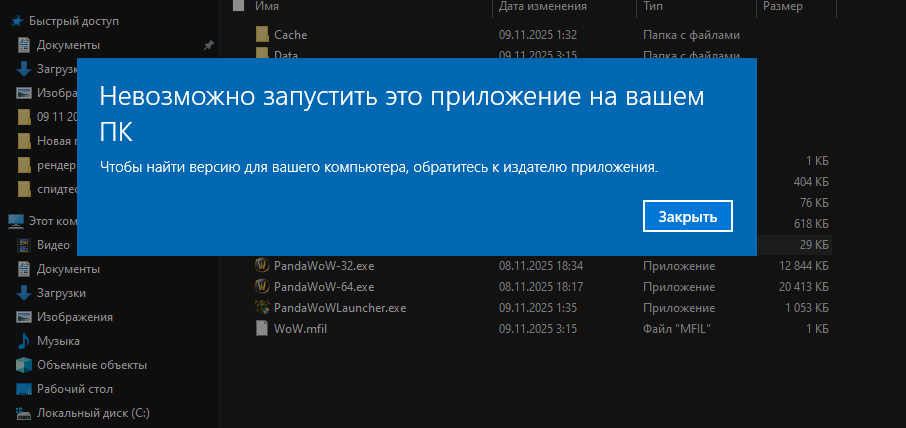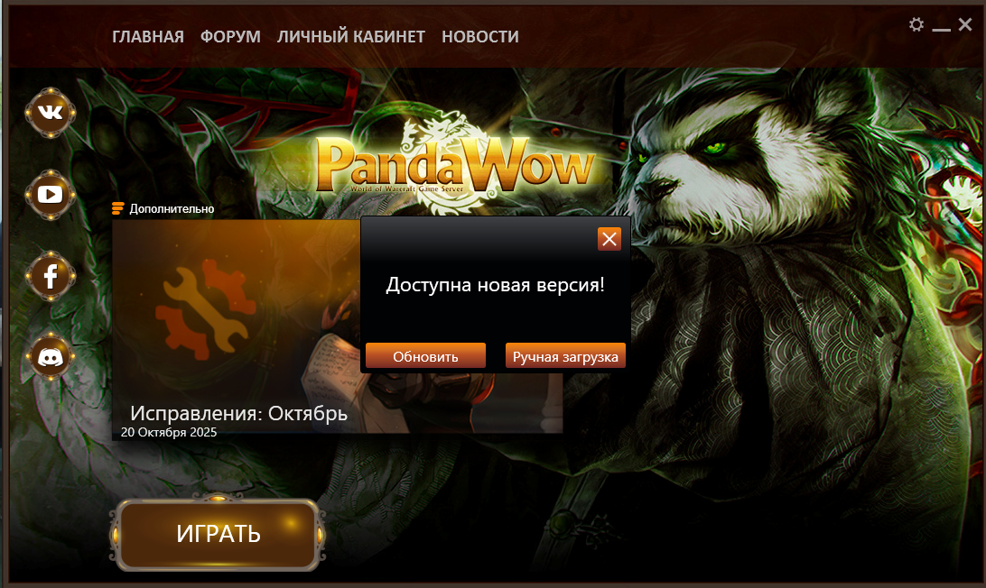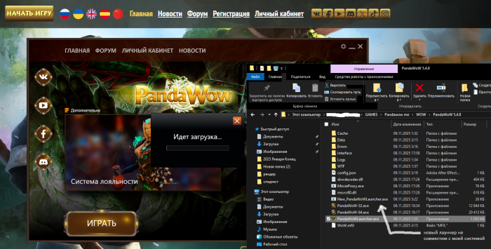 Здравствуйте. Попробуйте следующее: Скачайте обновления здесь (размер 685 МБ). Содержимое архива поместите в папку с игрой с заменой. Запустите игру через PandaWoWLauncher. * Если это не поможет, тогда, видимо, у Вас игра скачана не полностью. Скачайте игру полностью через Google Диск.