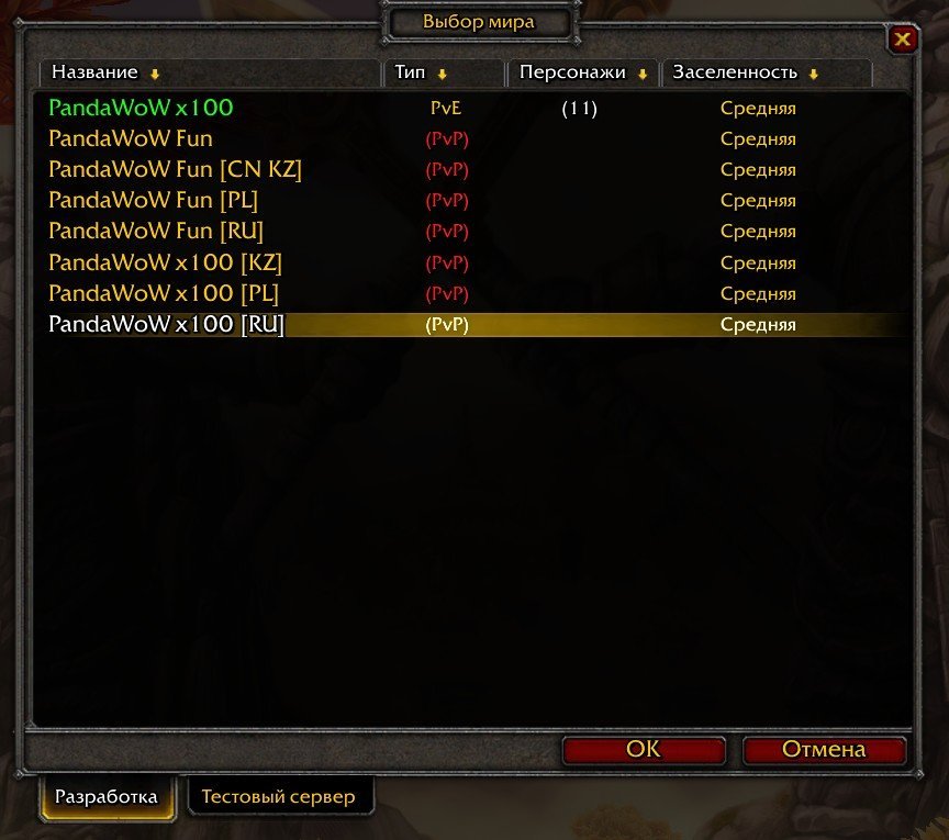Сам ты ушлепок! Они красным написаны, потому что они PvP, а не потому что они не доступны. Вот, пожалуйста, Fun тоже красный, но даже сейчас на него спокойно можно зайти. @DeadMouse Может сменить цвет шрифта у (PvP) с красного на зеленый, чтобы он уже перестал очковать и зашел наконец на PandaWoW x100 [RU], все у него загрузилось и он перестал сношать всем мозги?)))) - Today