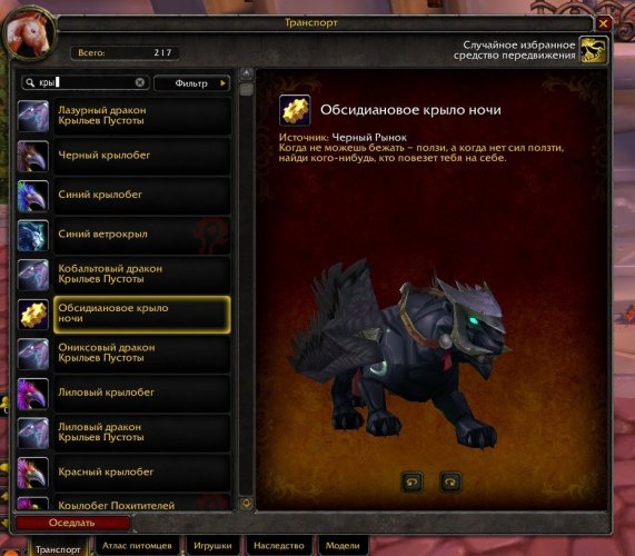 23. 1. Обсидиановое крыло ночи 2. Сегодня после загрузки обновления значок маунта превратился в шестеренку, а сам маунт перестал призываться. Секунда анимации и звука как будто ювелир шкрябает ограняет камень, а дальше тишина 3. Мой персонаж должен превращаться в единственного небесячего маунта, который не хрюкает, не булькает, не цокает, не ржот и не занимает весь экран своей толстенной ж... 4. х100 5. Это просто 100 из 10