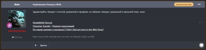 Здравствуйте, уважаемая администрация. Решил снова у Вас поиграть и при возможности пригласить новых игроков с официальной части Варкрафта, т.к. BLIZZARD наполнили игру политикой + проблемы с оплатой. Последний раз заходил в том году летом, позже уезжал добровольцем в ДНР, основной аккаунт + сторонние ремесленные аккаунты, форумные данные передавались на хранение двоюродному брату Артёму. Сейчас же при заходе на аккаунт игра зависает на стадии выбора персонажа. В личный кабинет заходит хорошо, без ошибок. Отсутствие блокировки аккаунта / блокировки чата. У самого Артёма смог узнать про блокировку форума, на фоне его вспыльчивости, но форум это не самое главное. Пожалуйста, напишите есть ли возможность снова вернуться на сервер для игры. Возможно, нужно что-то заплатить или чего-либо ещё. Буду ждать от Вас любого решения. Если нет возможности, то напишите почему. Логин аккаунта "bestpavelwow". На данный момент я сейчас пишу с этого же ПК, с которого всегда заходил в игру. (если это важно)