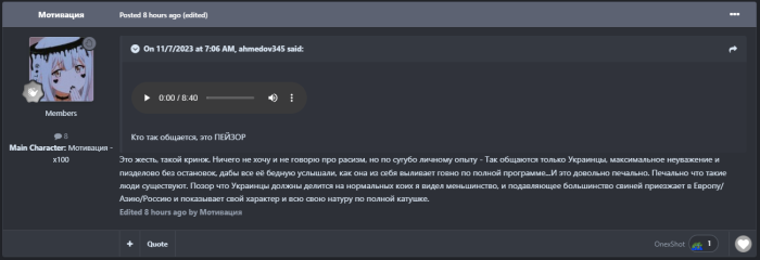 1. https://forum.pandawow.me/profile/106078-motivacija/ Ничего не говорит, но про свиней заикнулся. 2.14. Политика: на проекте запрещена религиозная, антирелигиозная и любая политическая пропаганда и агитация, любые политические дискуссии или замечания. Запрещаются выступления, какие-либо изображения, цитаты и т.д. политического, националистического, фашистского и расистского толка. Запрещена пропаганда насилия. Запрещены оскорбления на политической почве в отношении действующих политических деятелей (президентов, министров, депутатов и т.д.), государств, регионов, городов и пр. Мы - не политический форум.