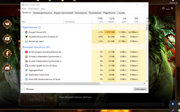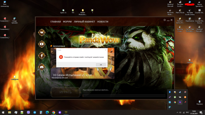 При обновлении лаунчера, краш и Crashlog.txt. Сюда txt грузить нельзя, ну покажу содержание. OS: Майкрософт Windows 10 Домашняя для одного языка (6.2.9200.0) x64 Installed language: ru-RU Physical memory: total 15, available: 9 Virtual memory: total 1, available: 1 Exception System.UnhandledExceptionEventArgs Detail info System.IO.IOException: Процесс не может получить доступ к файлу "D:\Games\PandaWoW\Data\frFR\wow-update-frFR-18278.MPQ", так как этот файл используется другим процессом. в System.IO.__Error.WinIOError(Int32 errorCode, String maybeFullPath) в System.IO.FileStream.Init(String path, FileMode mode, FileAccess access, Int32 rights, Boolean useRights, FileShare share, Int32 bufferSize, FileOptions options, SECURITY_ATTRIBUTES secAttrs, String msgPath, Boolean bFromProxy, Boolean useLongPath, Boolean checkHost) в System.IO.FileStream..ctor(String path, FileMode mode, FileAccess access, FileShare share, Int32 bufferSize, FileOptions options, String msgPath, Boolean bFromProxy) в System.IO.FileStream..ctor(String path, FileMode mode, FileAccess access, FileShare share, Int32 bufferSize, Boolean useAsync) в Launcher.Http.HttpClientDownloadWithProgress.<ProcessContentStream>d__14.MoveNext() --- Конец трассировка стека из предыдущего расположения, где возникло исключение --- в System.Runtime.CompilerServices.TaskAwaiter.ThrowForNonSuccess(Task task) в System.Runtime.CompilerServices.TaskAwaiter.HandleNonSuccessAndDebuggerNotification(Task task) в System.Runtime.CompilerServices.TaskAwaiter.GetResult() в Launcher.Http.HttpClientDownloadWithProgress.<DownloadFileFromHttpResponseMessage>d__13.MoveNext() --- Конец трассировка стека из предыдущего расположения, где возникло исключение --- в System.Runtime.CompilerServices.TaskAwaiter.ThrowForNonSuccess(Task task) в System.Runtime.CompilerServices.TaskAwaiter.HandleNonSuccessAndDebuggerNotification(Task task) в System.Runtime.CompilerServices.TaskAwaiter.GetResult() в Launcher.Http.HttpClientDownloadWithProgress.<StartDownload>d__12.MoveNext() --- Конец трассировка стека из предыдущего расположения, где возникло исключение --- в System.Runtime.CompilerServices.TaskAwaiter.ThrowForNonSuccess(Task task) в System.Runtime.CompilerServices.TaskAwaiter.HandleNonSuccessAndDebuggerNotification(Task task) в System.Runtime.CompilerServices.TaskAwaiter.GetResult() в Launcher.MainWindow.<_StartDownload>d__42.MoveNext() --- Конец трассировка стека из предыдущего расположения, где возникло исключение --- в System.Runtime.CompilerServices.AsyncMethodBuilderCore.<>c.<ThrowAsync>b__6_1(Object state) в System.Threading.QueueUserWorkItemCallback.WaitCallback_Context(Object state) в System.Threading.ExecutionContext.RunInternal(ExecutionContext executionContext, ContextCallback callback, Object state, Boolean preserveSyncCtx) в System.Threading.ExecutionContext.Run(ExecutionContext executionContext, ContextCallback callback, Object state, Boolean preserveSyncCtx) в System.Threading.QueueUserWorkItemCallback.System.Threading.IThreadPoolWorkItem.ExecuteWorkItem() в System.Threading.ThreadPoolWorkQueue.Dispatch() в System.Threading._ThreadPoolWaitCallback.PerformWaitCallback()