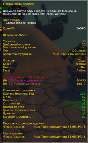 1) Призыв Шадры 2) х100 3) Нет локализации завершения. Великолепно! Сегодня ты отлично послужил Темной Госпоже, <название>. Эта ядовитая кровь обеспечит нашу армию всевозможным смертоносным оружием против мерзкого Альянса. Мы выгоним их с этих земель. За Орду, разумеется… и только благодаря тебе. https://db.pandawow.me/?npc=43007 - заселена всегда, должна появляться по заданию. Нет сценки, появляется группа отрекшихся, начинаем бить https://db.pandawow.me/?npc=43007, убиваем, они терзают чутка ещё труп и потом убегают да исчезают.