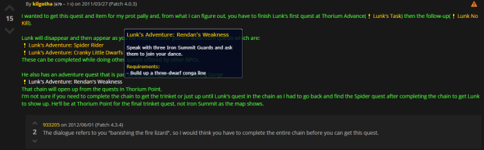 1. https://db.pandawow.me/?npc=47269 2. Дает единственный кв https://db.pandawow.me/?quest=28053 , за который под бафами на экспу можно получить с 46 по 62 лвл, при этом ничего не делая. 3. Кв https://db.pandawow.me/?quest=28053 должен открываться после прохождения цепочки кв, судя по вовхеду, ссылка https://www.wowhead.com/quest=28053/lunk-like-your-style : 4. все реалмы. 5. 30.11.2023 6. 2/10 дает ускорение в прокачке. @Mel