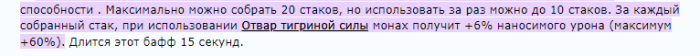 1. Отвар тигриной силы https://db.pandawow.me/?spell=125196 2. При повтором использовании спелла "Отвар тигриной силы" https://db.pandawow.me/?spell=116740 не добавляет проценты и не обновляет баф "Отвар тигриной силы" https://db.pandawow.me/?spell=137591 3. При использовании "Отвар тигриной силы" https://db.pandawow.me/?spell=116740 накладывается баф "Отвар тигриной силы " https://db.pandawow.me/?spell=137591 в зависимости от стаков (от 1-10, максимум стаков может быть 20) повышает определенный процент наносимого урона и исцеления (максимум 60). У вас на сервере если ты получил баф на 50% скажем при 8 стаказ "Отвар тигриной силы", а потом используешь снова пока баф не пропал, но уже на 2х стаков, что дает 10%, бафу на 50% не добавляется 10%, а просто обновляет его, хотя по механикам пандарии оно должно добавлять, до не более 60% Может найдутся интузиасты которые решатся найти ролик ретейла, где 5.4 был актуален на тот момент и видно как работает 4. х100 Прикрепил видео как работает у нас Так же у нас если у тебя есть более 10 станов, допустим 20, то они тратятся все, но из-за описаний спелла и блютрекера следует, что больше 10 стаков потратить ты не можешь, не ясно почему сгоряют тогда все desktop-20231121-20560501_QYalUiTn.mp4