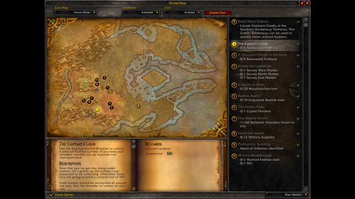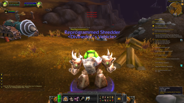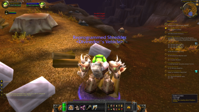 This bug is occuring on the Pandawow MOP 5x server https://www.wowhead.com/quest=14134/the-captains-logs "Use the Reprogrammed Shredder to collect 6 piles of Azshara Lumber. If you lose your shredder, another can be attacked and reprogrammed." So the quest is called: The Captain's Logs This is a Horde quest in Azshara. The quest starts and ends at the NPC Labor Captain Grabbit at approximately 27,77 in Azshara.. where you are supposed to use the reprogrammed Shredder to be able to collect the logs. So you attack the shredder it gets down to a low health it runs away you click on the shredder reprogram it and then you get into the shredder. That is all great I am in the shredder I hit 1 which is supposed to be used to collect the logs but it says invalid target. I can't target the logs either it won't let me you can't collect the logs. And no standing on the logs or at the side did not work either I tried both of those as I read the comments on Wowhead first. Getting the shredder and reprogramming it and getting into the shredder is easy it is getting the logs that are not working. You can't hit 1 and pick up the logs like you are supposed to. It just says invalid target I can't target the logs to tell it that is what I want to pick up the logs are sparkling like they are part of the quest but it is not working you can't target the logs and actually pick them up. You can't target the logs I have even tried standing on top of the log piles and then try collecting them and that didn't work either. Even with NO addons this quest is screweing up the quest is buggy. I am doing this quest with my level 18 Discipline Priest. As I said even with absolutely NO addons enabled this quest does not work. This quest is broken please look into it and fix it. Screenshots are attached and also can be seen at the links bellow https://ibb.co/HNMqZFt https://ibb.co/2gCknct https://ibb.co/VSFLKw4 This quest is just maddening! It is driving me crazy! Can you please fix this? Thanks, Jamie (she / her)