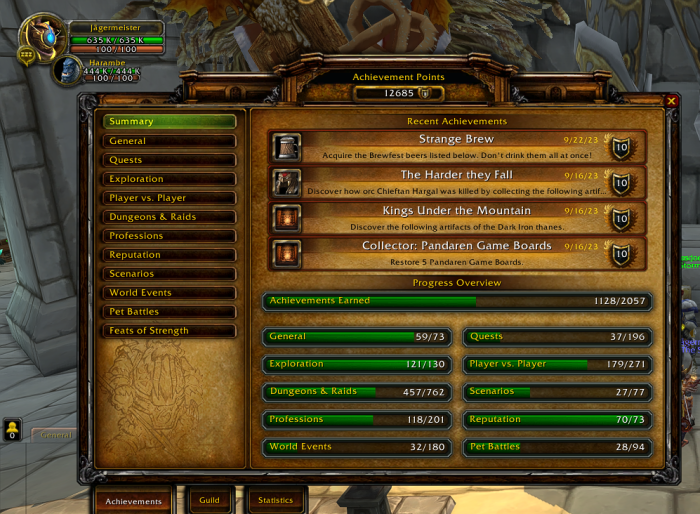 Cutter Posted September 23, 2023 Posted September 23, 2023 Greetings and i hope i'm opening this thread at the right place. Recently i was farming achievement points in order to get in the Top 50 in achievements on the PandaWowFun realm. As of now, i have 12,685 points (picture uploaded) which should put me in the Top 50 but i'm not there. Could this be a webpage problem or something? All i'm asking is for the right people to review and solve this bug/issue. Thank you, Jägermeister